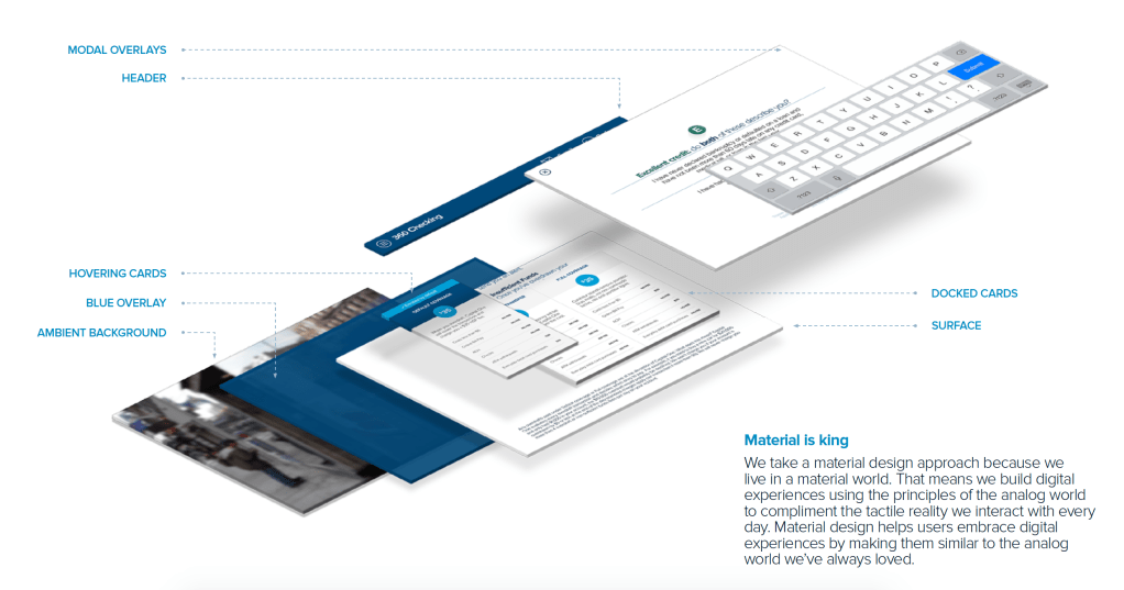 Our styleguide included UI components, layout grids, colors, typography, iconography, and also motion design guidelines and material layers architecture.